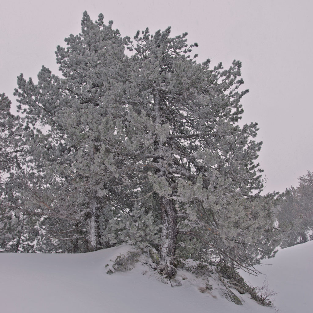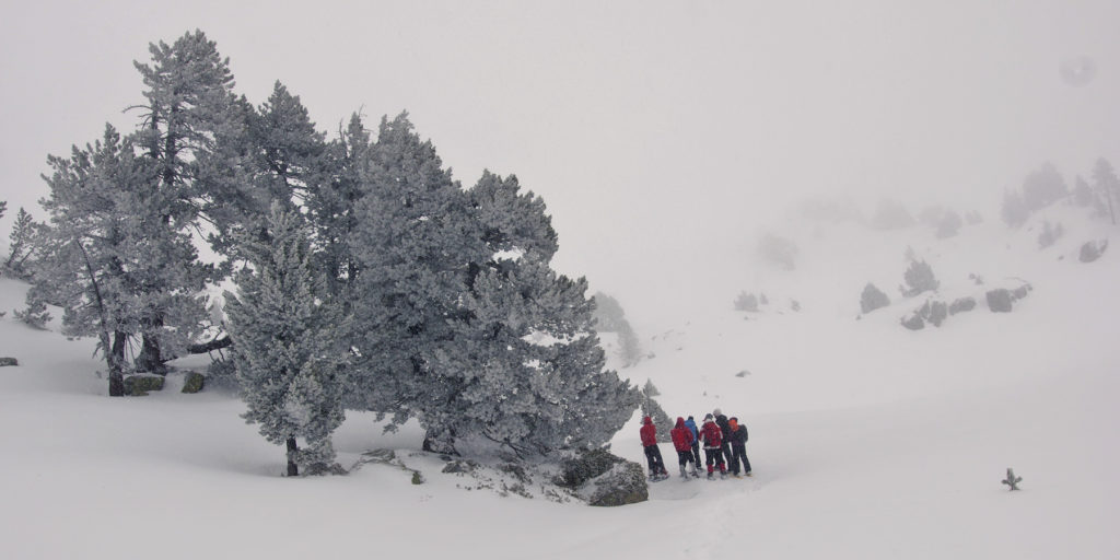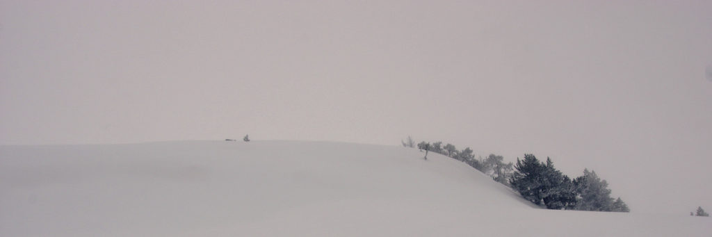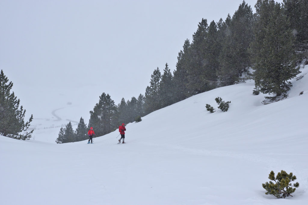 Très vite nous quittons la station et progressons dans la poudreuse au milieu des pins à crochets. Et sous ce ciel bas, nous découvrons un paysage d’une grande beauté.