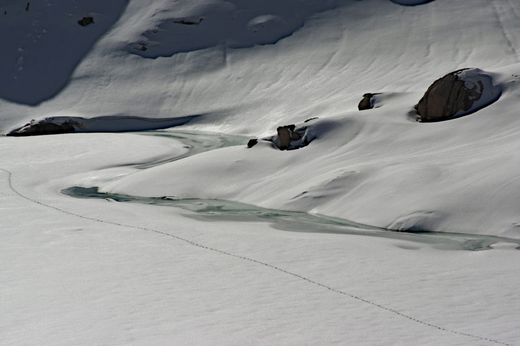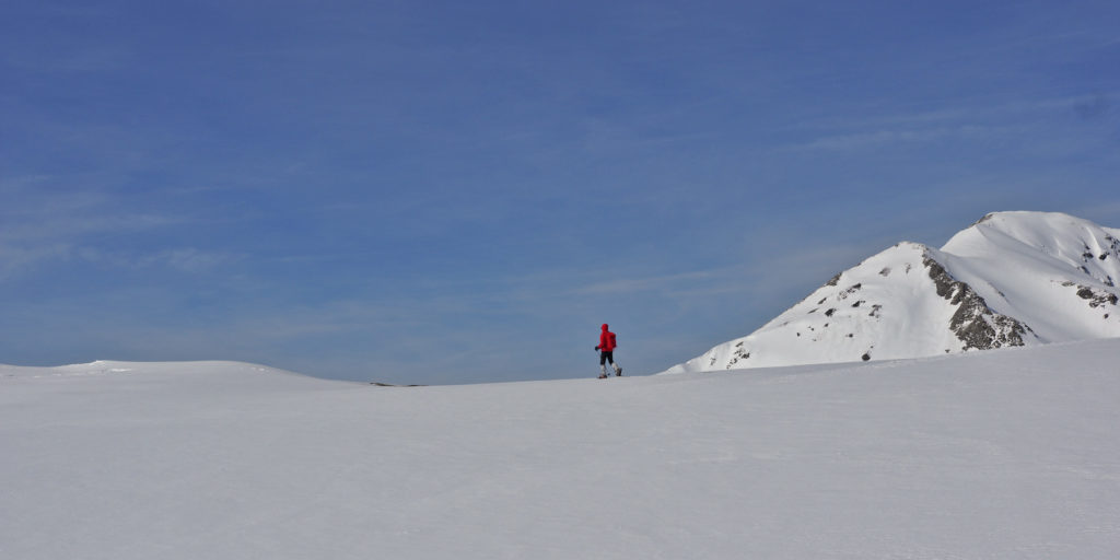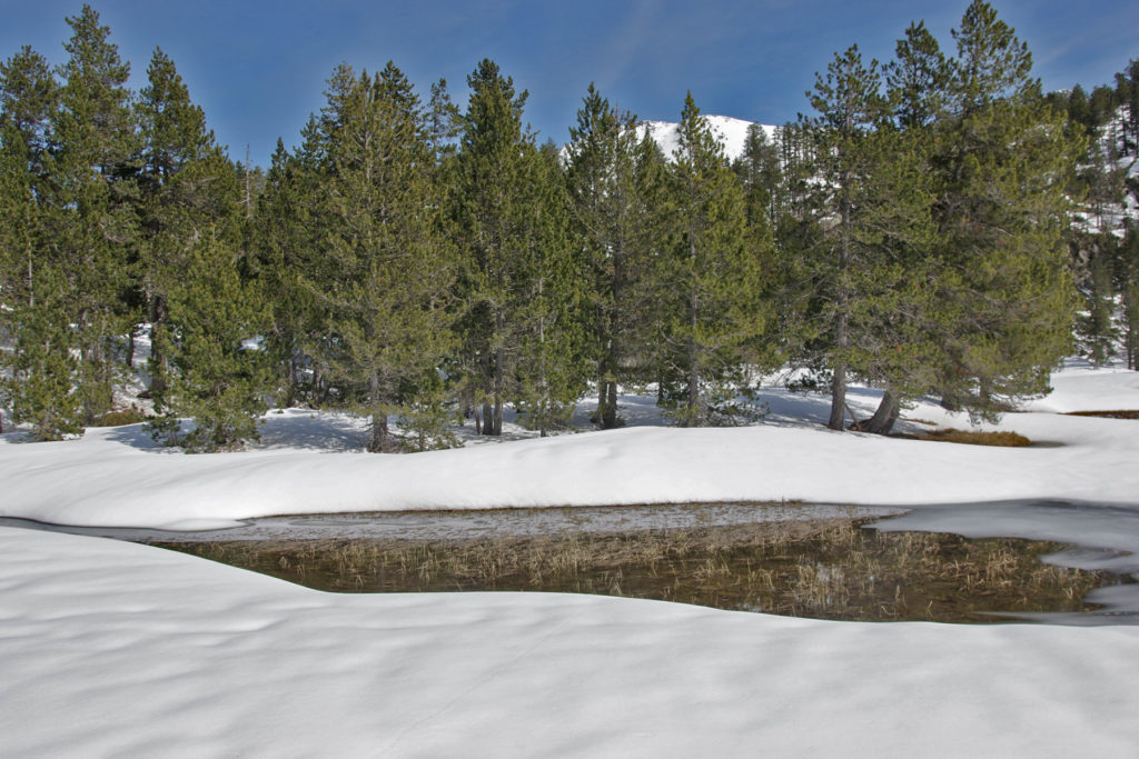 Nous nous faufilons dans les combes, entre les pins à crochets, atteignons de petits dômes, souvent couronnés de neige plus dure, puis dévalons vers un petit lac que nous traversons à pied, tel Moïse.