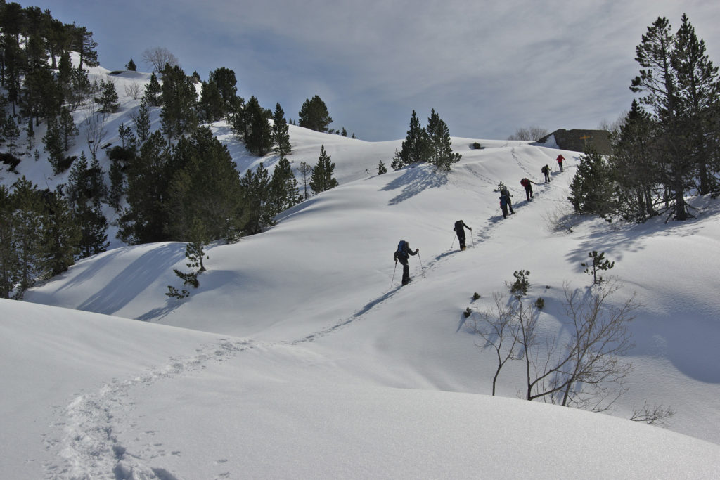 Regaillardis, nous attaquons à monter dans une forêt claire de pins à crochets, sur les flancs de la Serre de Parros.