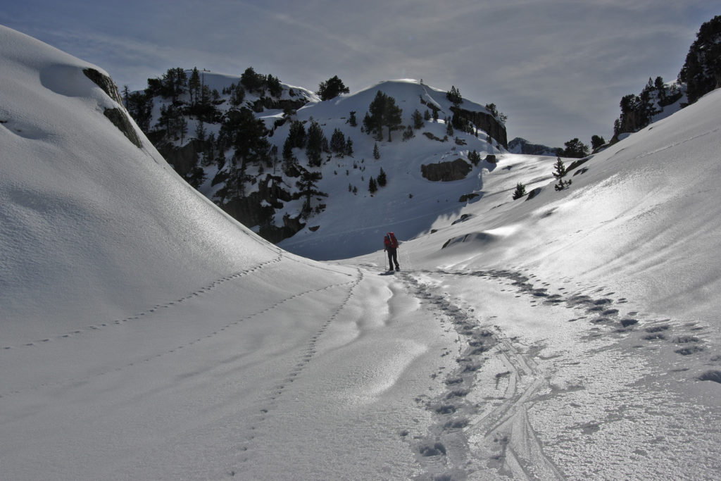 La journée démarre tranquillement, nous remontons doucement la vallée de l’Aygamog jusqu’aux bains de Tredos. Nous évoluons sur une large piste dans la pinède et débouchons dans un large fond de vallée.
